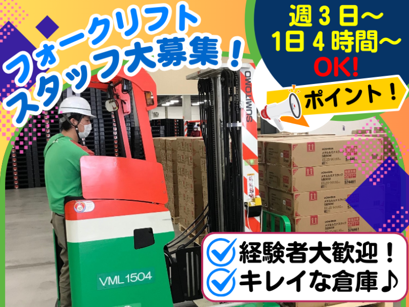 【週3日~/1日4時間~勤務OK✨】15時~勤務で時給1600円!キレイな倉庫でのフォーク作業/資格・経験を活かせるお仕事!